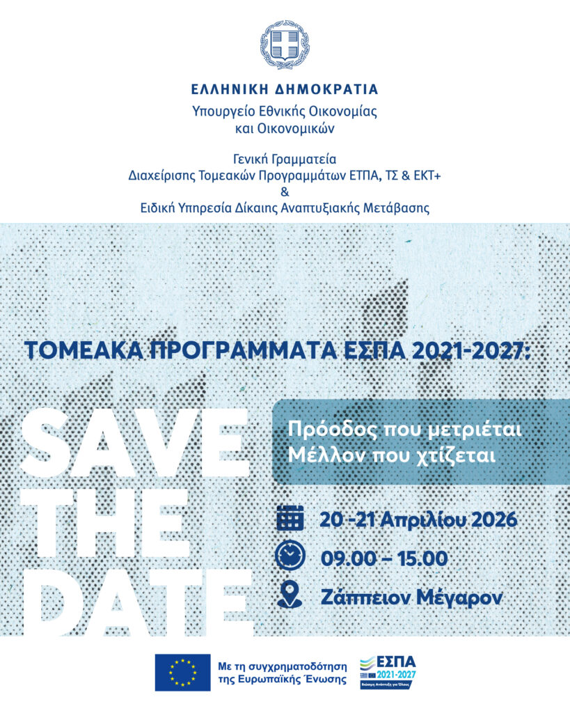 02/04/2026: ΤΟΜΕΑΚΑ ΠΡΟΓΡΑΜΜΑΤΑ ΕΣΠΑ 2021-2027 | Πρόοδος που μετριέται – Μέλλον που χτίζεται 02/04/2026 Διαβάστε Περισσότερα »